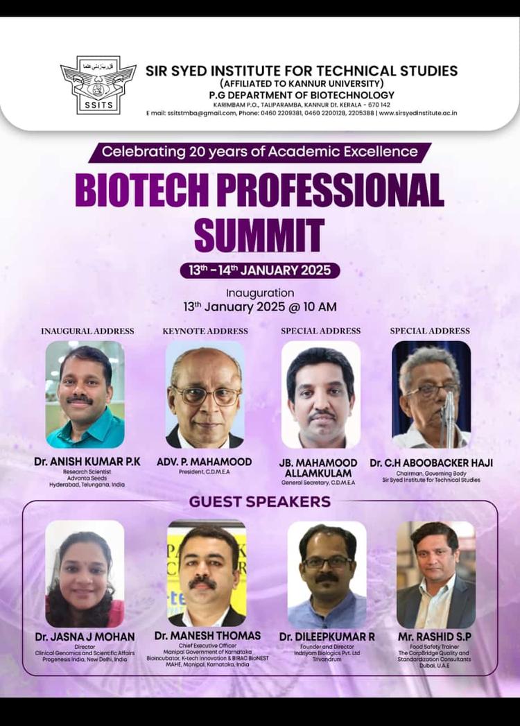 The Department hosted the Biotech Professional Summit on January 13th and 14th, 2025, aiming to provide students with insights into the latest trends, innovations, and challenges within the biotechnology industry. The summit was officially inaugurated by Dr. Anish Kumar P.K, a Research Scientist at Advanta Seeds, Hyderabad, Telangana. Day 1 featured a series of engaging presentations. The first speaker was Dr. Anish Kumar P.K, who delivered an insightful talk on “Digital Breeding: New Age Exploration of AI and NGS in Plant Molecular Biology and its Applications in the Seed Industry”. Following this, Session II was led by Dr. Dileep Kumar R, Founder and Director of Indriyam Biologics Pvt Ltd, Trivandrum, who discussed “Bioentrepreneurship: Opportunities and Challenges”. Day 2 saw three more sessions. Dr. Maneesh Thomas, CEO of the Manipal-Government of Karnataka Bioincubator, Manipal, Karnataka, provided valuable insights on “Emerging Trends and Opportunities for Bioentrepreneurs” in the first session. Sessions IV and V were conducted online. Dr. Jasna J. Mohan, Director of Clinical Genomics and Scientific Affairs at Progenesis India Pvt Ltd, Delhi, presented on “Current Advancements in Biotechnology: Transforming Medicine and Healthcare”, offering a deep dive into innovations within the healthcare sector. Mr. Rashid SP, a Food Safety Trainer at The CorpBridge Quality and Standardization Consultants, Dubai, UAE, concluded the summit with a session on “Building a Career in Food Safety: Exploring Job Opportunities and Certification Paths”, providing guidance on career opportunities in the food industry. The summit provided an enriching platform for students to learn from distinguished experts and gain a deeper understanding on bioentrepreneurship.