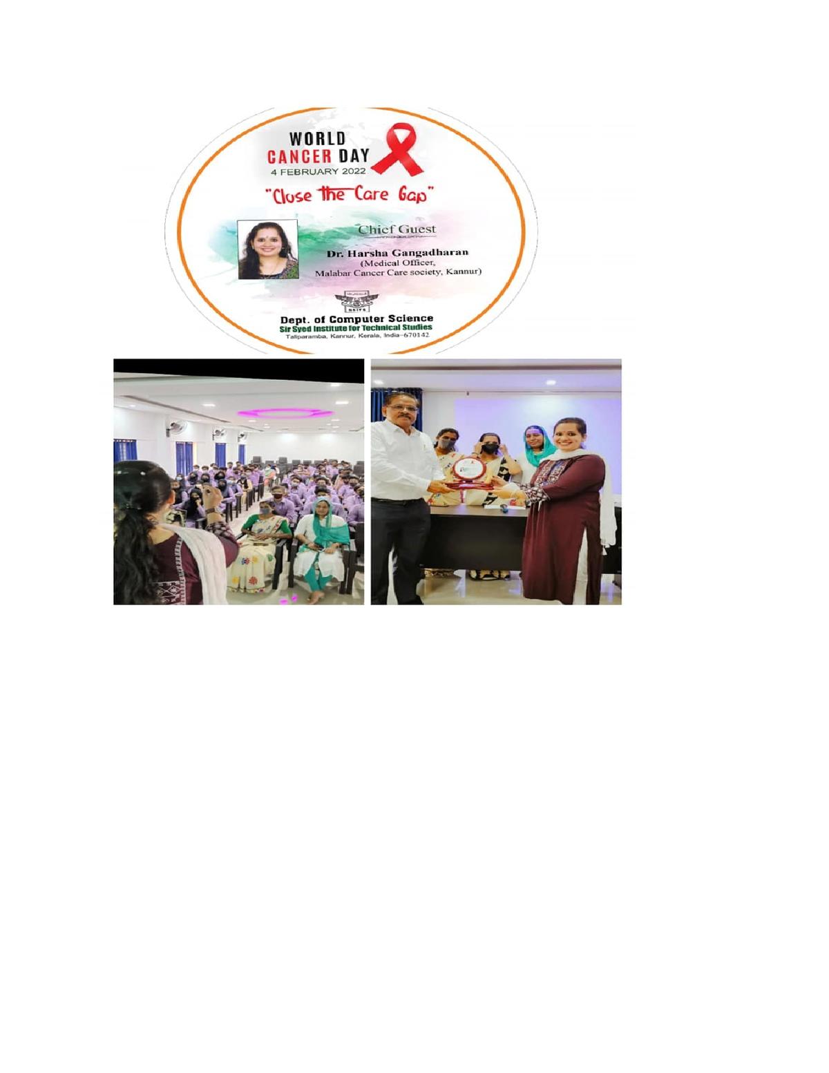 Department of Computer Science was organized a Cancer awareness class at New Seminar hall on 4/02/22. The program started with welcome speech by Mrs. Ramya Raghunath ,Presidential address was carried out by Dr. K.M ...