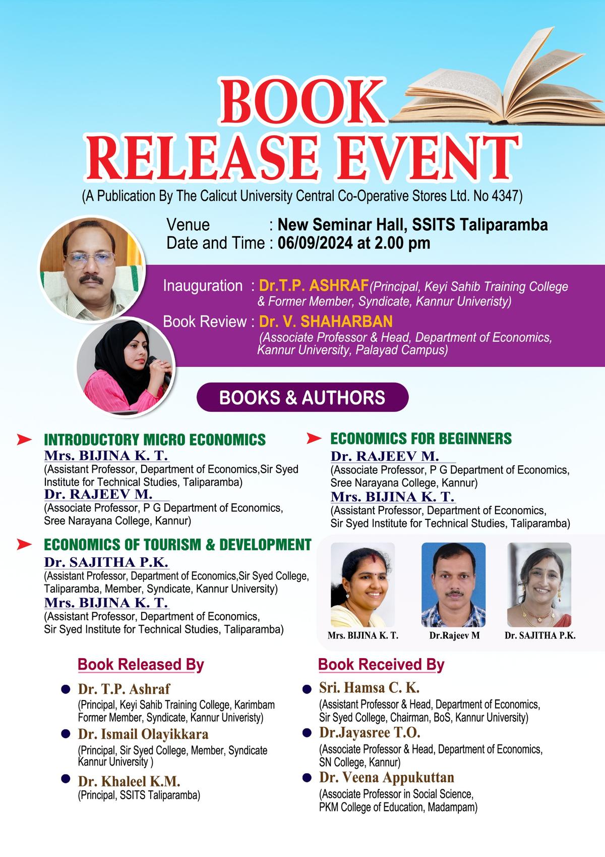 The Economics Department of Kannur University organized a book release event on 6th September 2024 at the New Seminar Hall, SSITS Taliparamba. The event marked the release of several important textbooks for the ...