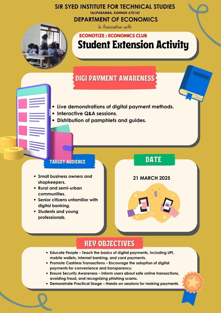 The Department of Economics at Sir Syed Institute for Technical Studies, Taliparamba, Kannur, in association with the Economics Club "ECONOTIZE," organized a Student Extension Activity titled "Digi Payment Awareness" on ...